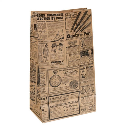 Paper bags, block, "American" style, measuring 25 cm x 15 cm x 43,5 cm. They have an original print in the atmosphere of a newspaper from years ago. They are made of 100% paper.