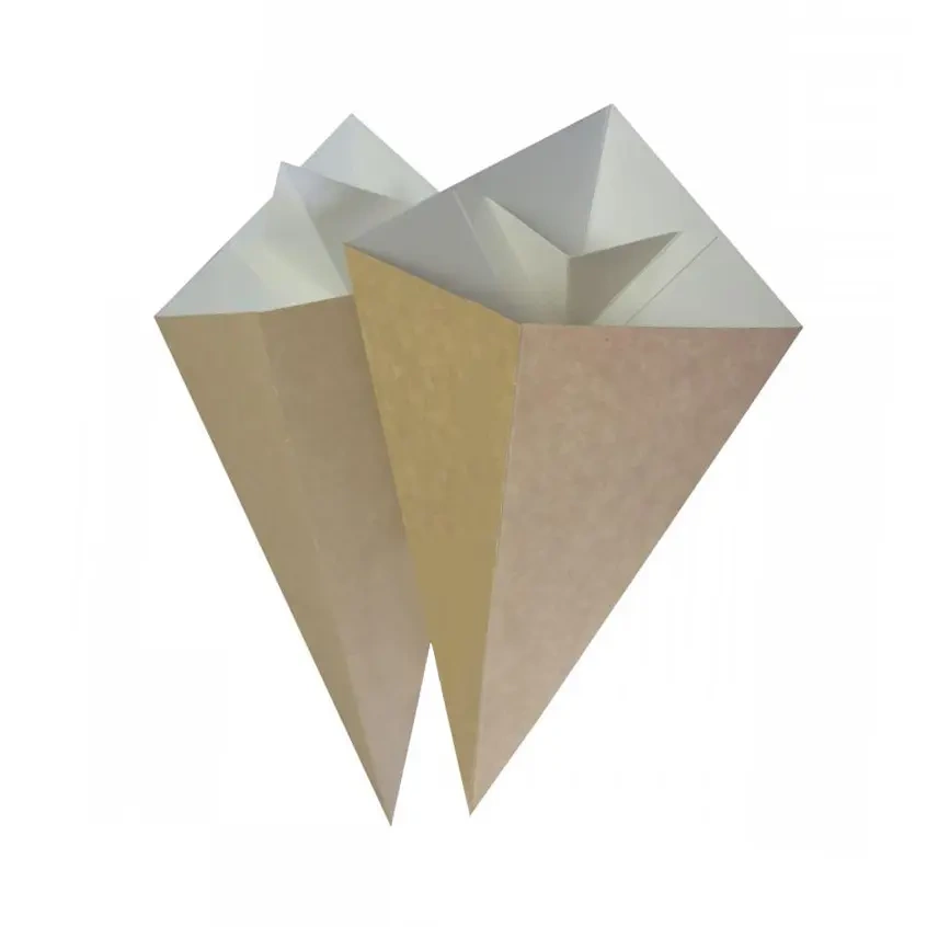 Cardboard bags in the shape of a cone with an additional pocket for sauce/dip, measuring 20 cm x 35 cm. Made of 100% cardboard.