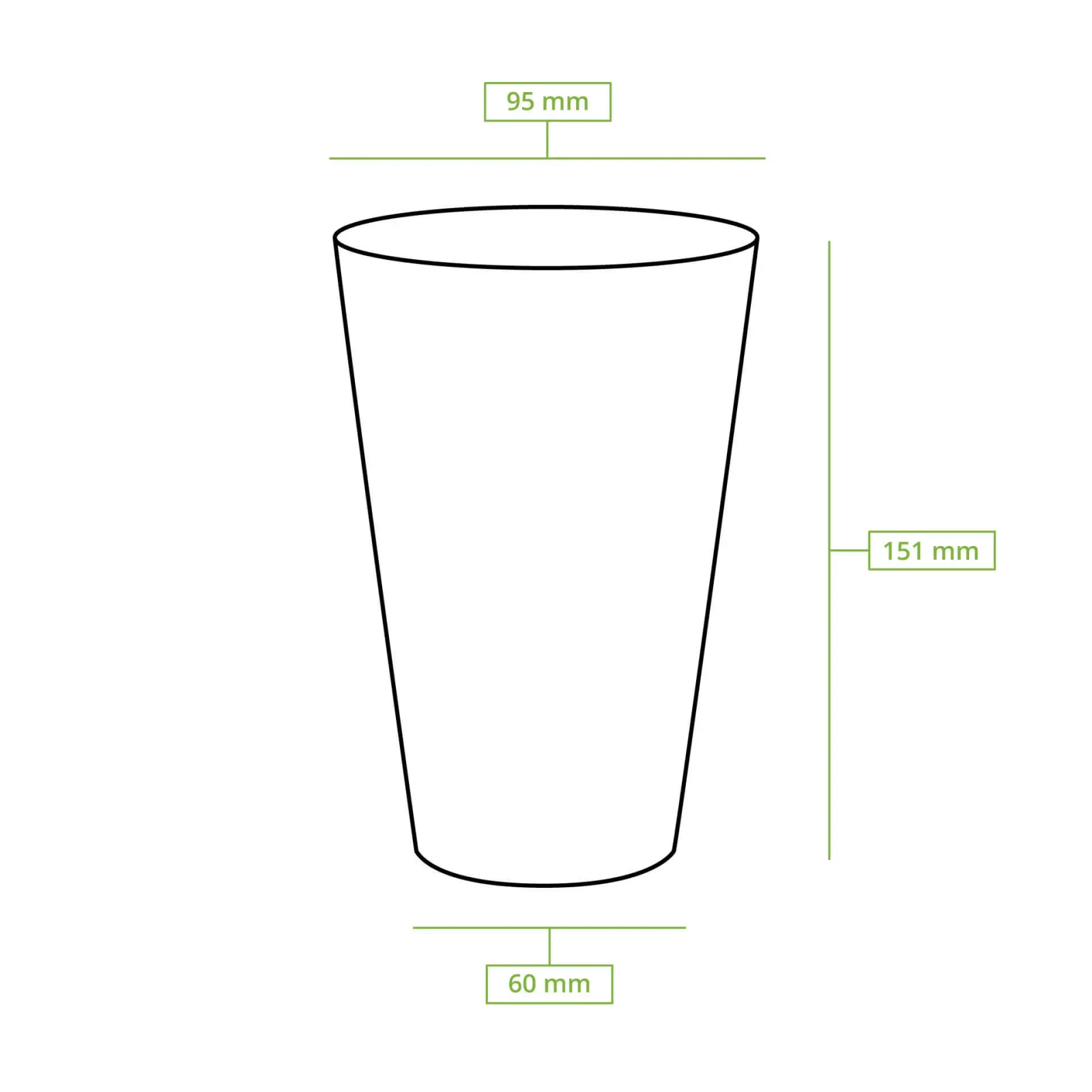 Cups with a capacity of 500 ml and a diameter of 95 mm. Entirely made of PLA (cornmeal-based plastic)*.