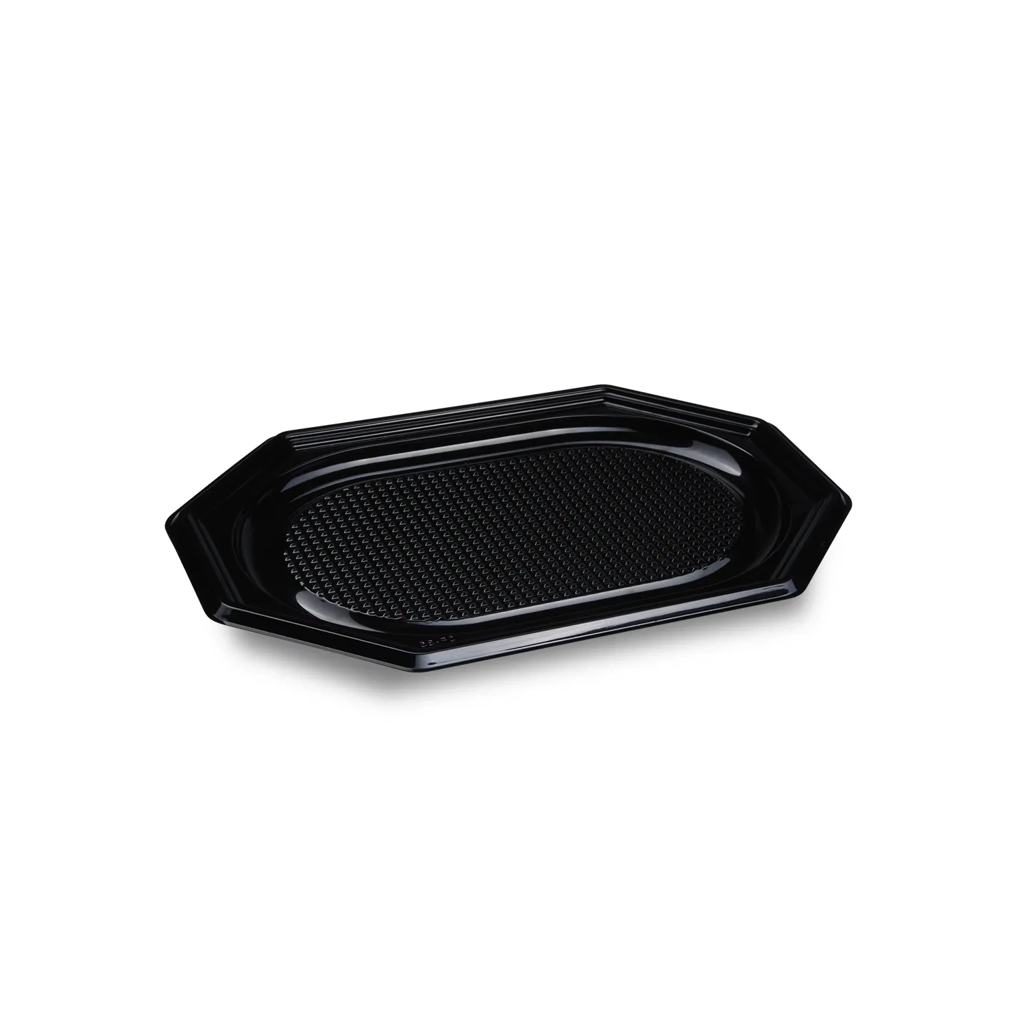 Elegant, black catering trays made of durable rPET* are perfect for serving and transporting dishes during events, catering services, or parties. Their oval shape gives dishes an attractive appearance. We also offer transparent lids that fit these trays perfectly. They effectively protect and at the same time display the contents – you can find them below the product description.