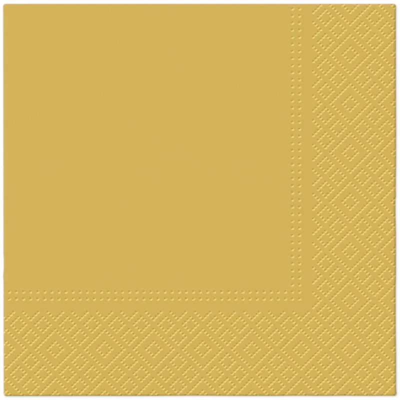 Gold 3-ply napkins, measuring 33 cm x 33 cm, folded 1/4. Made of 100% tissue paper.