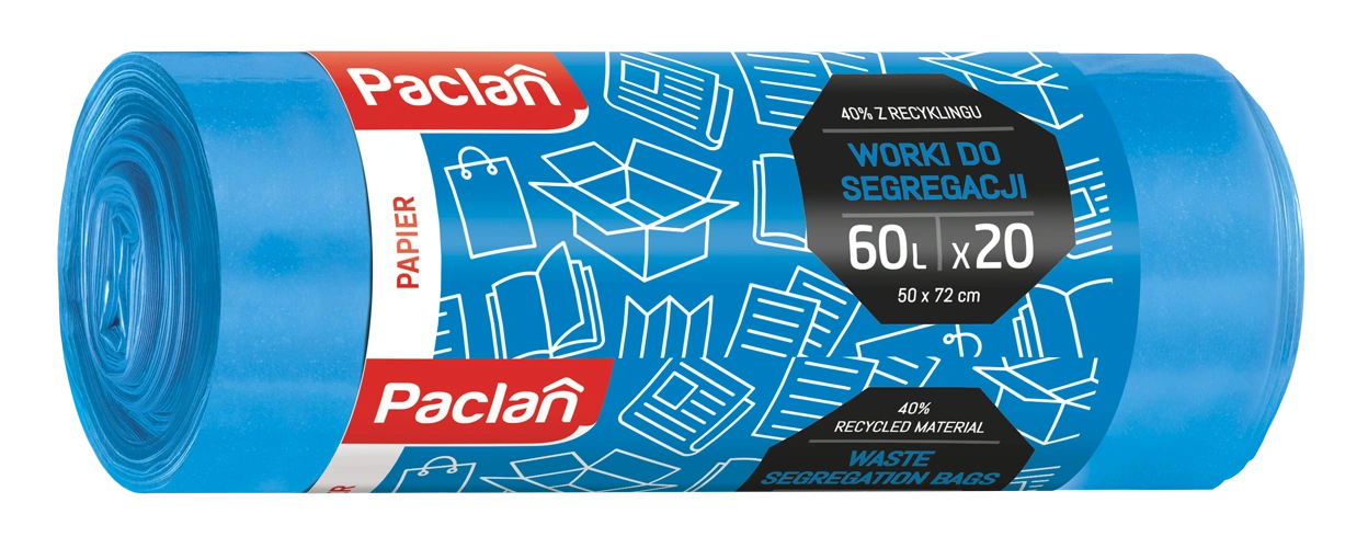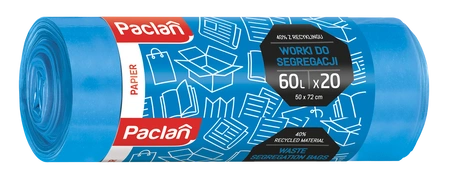 Colourful garbage bags by Paclan in blue, designed for paper waste segregation. The package contains 20 bags with a capacity of 60 L.