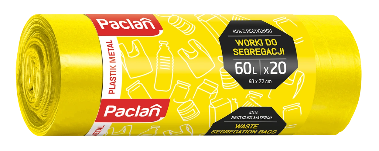 Colourful garbage bags by Paclan in yellow, designed for plastic and metal waste segregation. The package contains 20 bags with a capacity of 60 L.