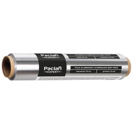 Food-grade aluminium foil with a width of 29 cm, a length of 60 m and a thickness of 15 μm (extra thick!), on a roll. Paclan brand product.