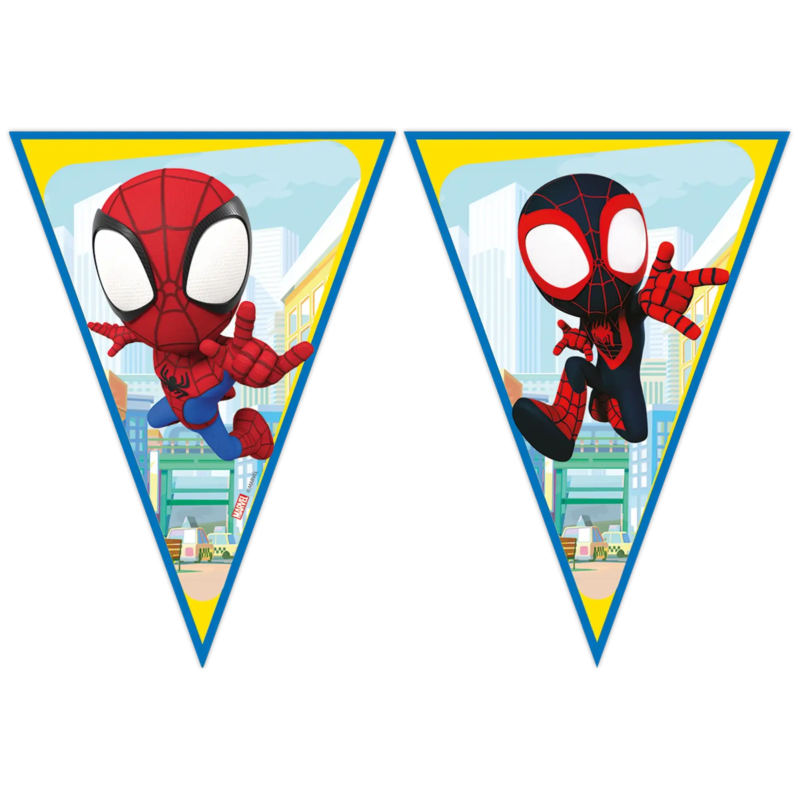 Paper garland with the Spidey motif. It has a length of 230 cm, and each flag has a height of 25 cm.
