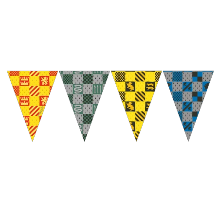 Paper garland with the Harry Potter motif. It has a length of 230 cm, and each flag has a height of 25 cm.