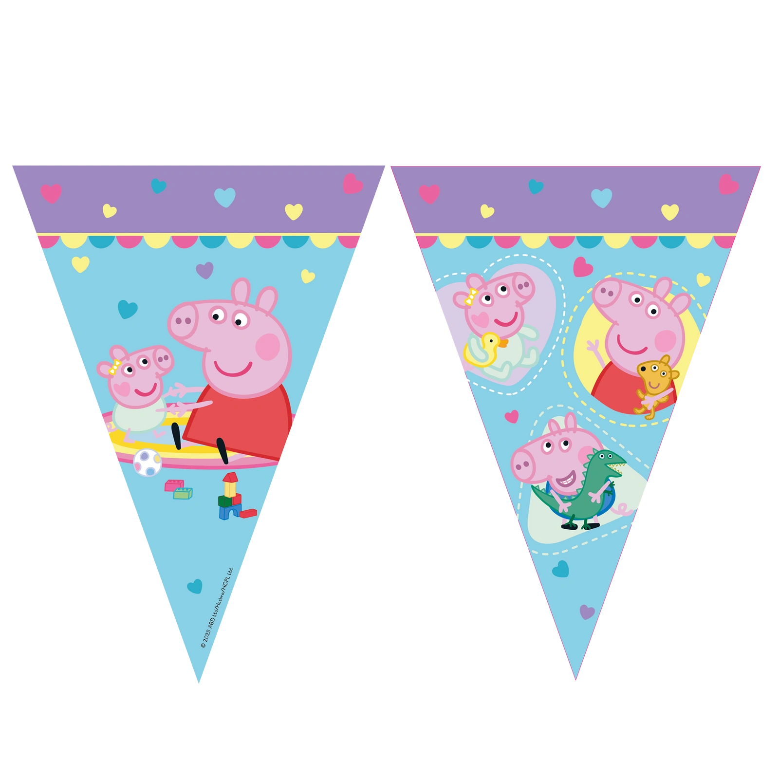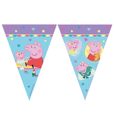 Paper garland with the Peppa Pig motif. It has a length of 230 cm, and each flag has a height of 25 cm.