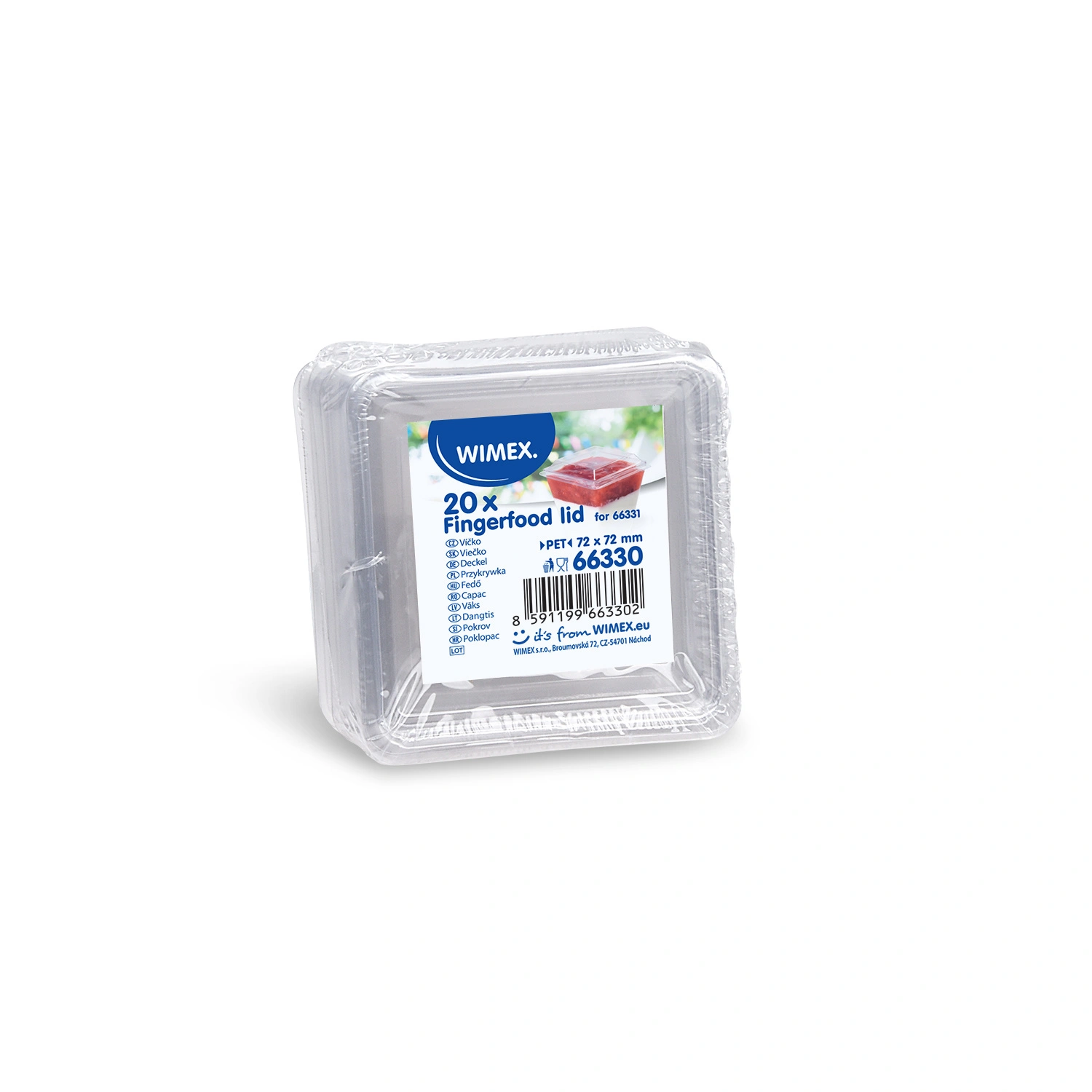 Transparent flat lids for containers measuring 7.7 cm x 7.7 cm. Made entirely from PET.