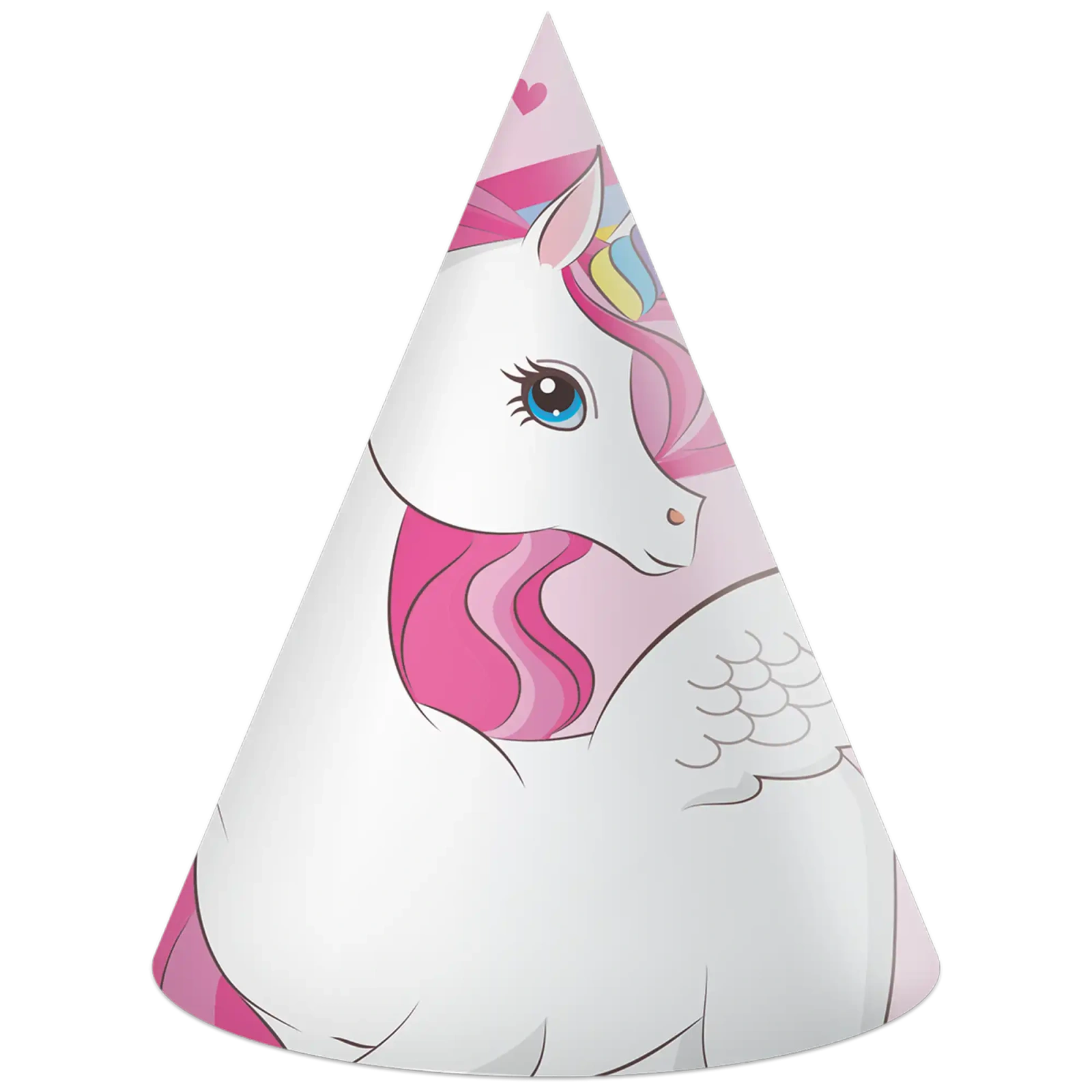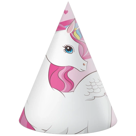 Set of 6 paper birthday hats with the “Unicorn” motif is a perfect addition to a themed children’s party. Colorful graphics featuring favorite cartoon heroines will make little guests feel the true party atmosphere, while the overall decoration gains a cohesive, fairy-tale character.