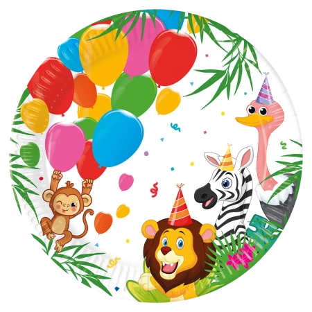 Set of 8 round, flat paper plates with Jungle motif, 23 cm in diameter, made of 100% paper is a practical and eco-friendly addition for birthdays and other children’s parties. The plates are perfect for serving snacks and meals, adding a colorful, themed accent to the table and emphasizing the joyful atmosphere of the party.