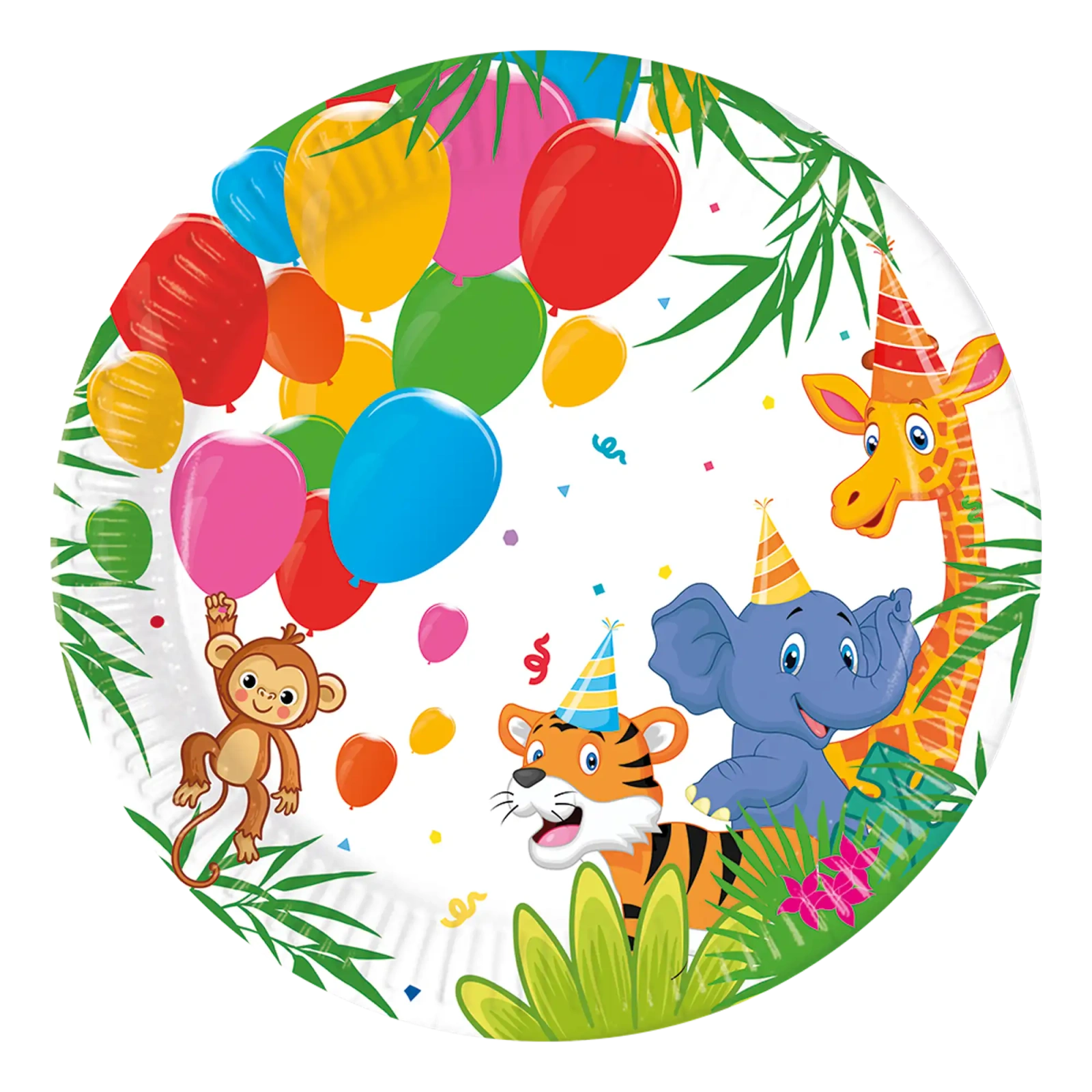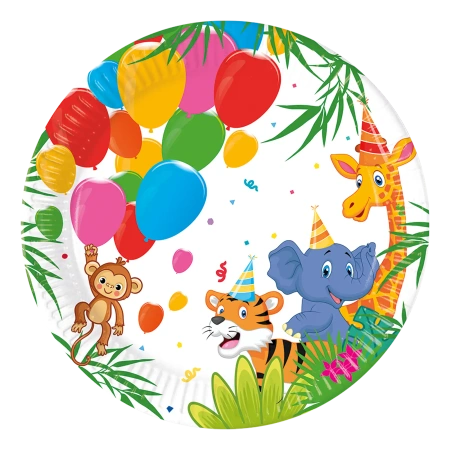 Set of 8 round, flat paper plates with Jungle motif, 20 cm in diameter, made of 100% paper is a practical and eco-friendly addition for birthdays and other children’s parties. The plates are perfect for serving snacks and meals, adding a colorful, themed accent to the table and emphasizing the joyful atmosphere of the party.
