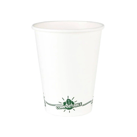 Jednowarstwowe kubki ekologiczne w kolorze białym o pojemności 350 ml i średnicy 90 mm. Wykonane zostały w 100% z papieru powlekanego tworzywem roślinnym PLA.