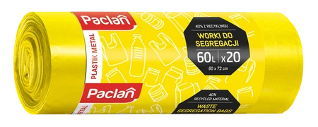 Kolorowe worki na śmieci marki Paclan w kolorze żółtym, przeznaczone do segregacji tworzyw sztucznych i metali. Opakowanie zawiera 20 sztuk worków o pojemności 60 l.