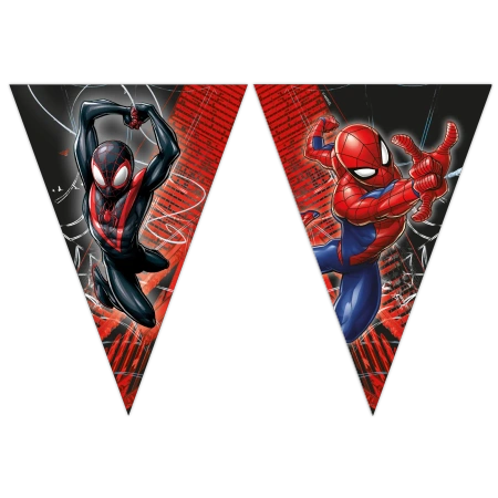 Papierowa girlanda z motywem Spider-Man. Ma ona długość 230 cm, a każda flaga ma wysokość 25 cm.