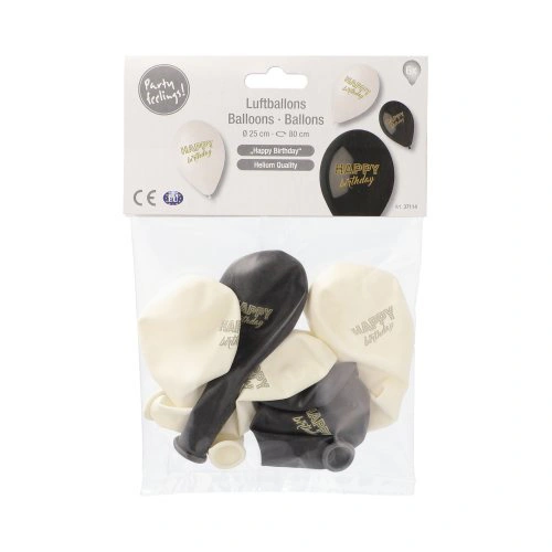 Balony na urodziny i przyjęcia marki PAPSTAR w kolorach czarnym i białym z napisem „Happy Birthday” to elegancka dekoracja, która sprawi, że każde przyjęcie nabierze wyjątkowego charakteru. Zestaw zawiera 6 balonów o średnicy około 25 cm, idealnych do stworzenia efektownej ścianki dekoracyjnej lub girlandy.