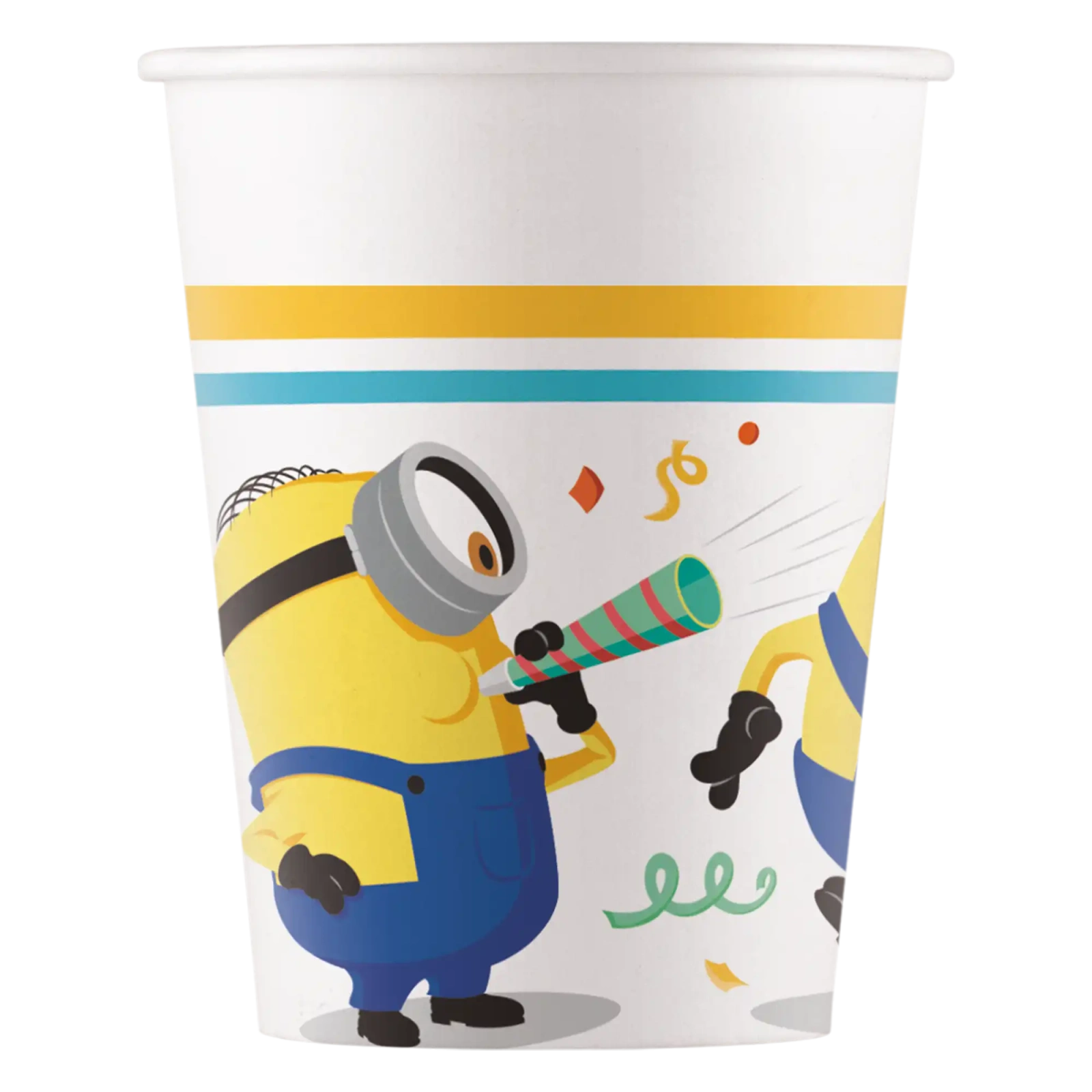 Ekologiczne kubki papierowe, z kolorowym nadrukiem z motywem Minionki, o pojemności 200 ml. Świetnie sprawdzą się na imprezach urodzinowych dziecka czy na przyjęciach, w których uczestniczą najmłodsi.