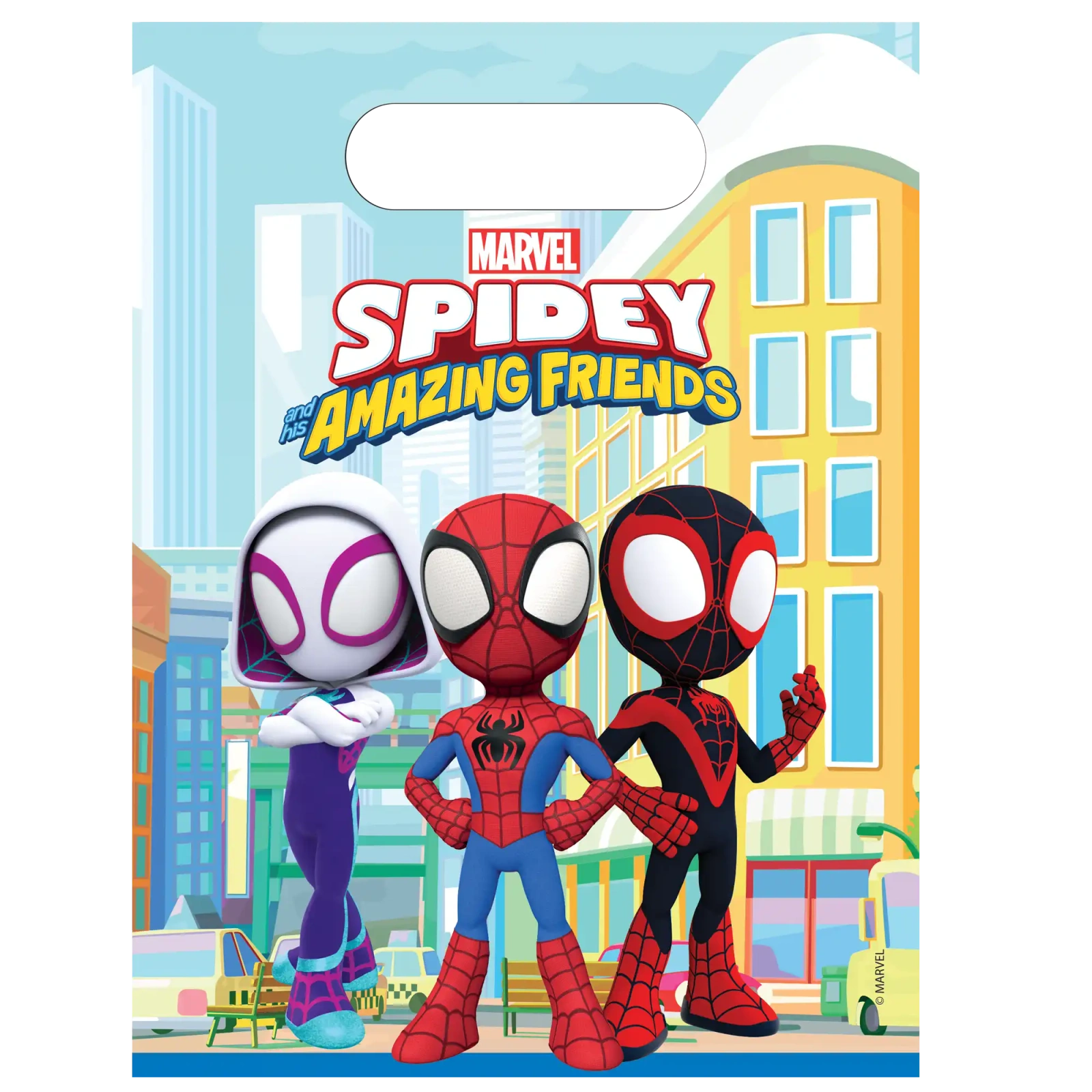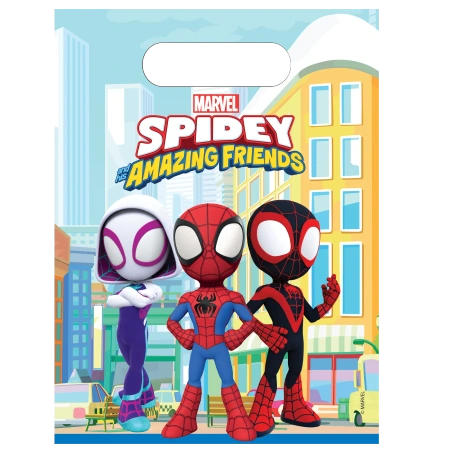 Zestaw 6 sztuk foliowych torebek prezentowych z motywem Spidey o wymiarach 17 × 23 cm to praktyczny i efektowny sposób na pakowanie słodyczy czy drobnych upominków.