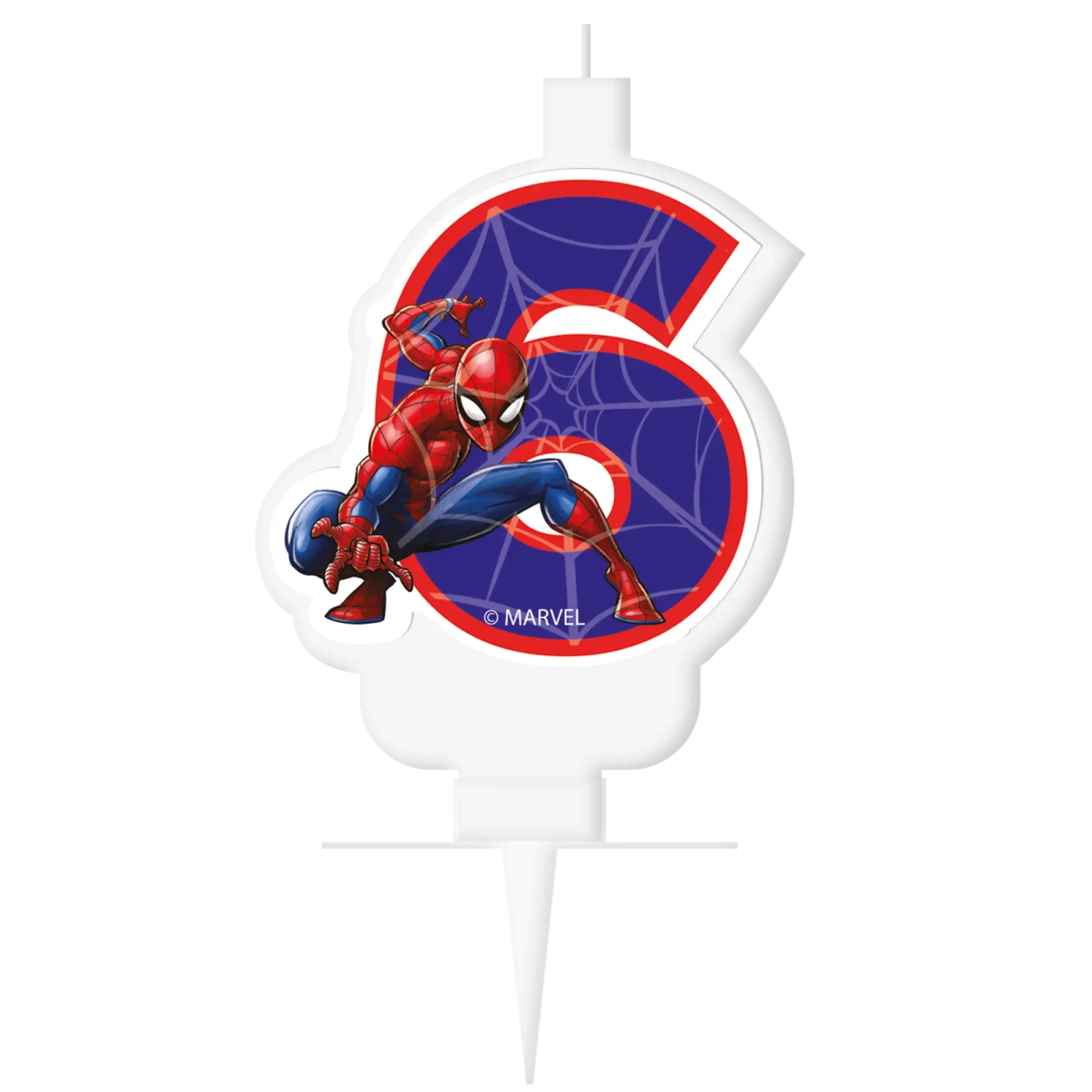 Świeczka urodzinowa z motywem Spiderman Marvel, przedstawiająca cyfrę 6. Opakowanie zawiera 1 sztukę świeczki o wysokości około 10 cm.