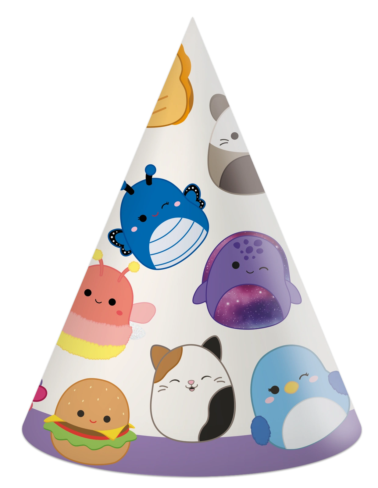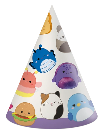 Zestaw 6 papierowych czapeczek urodzinowych z motywem "Squishmallows” to idealny dodatek na dziecięce przyjęcie tematyczne. Kolorowa grafika z ulubionymi bohaterkami bajki sprawi, że mali goście poczują prawdziwy imprezowy klimat, a cała aranżacja nabierze spójnego, bajkowego charakteru.