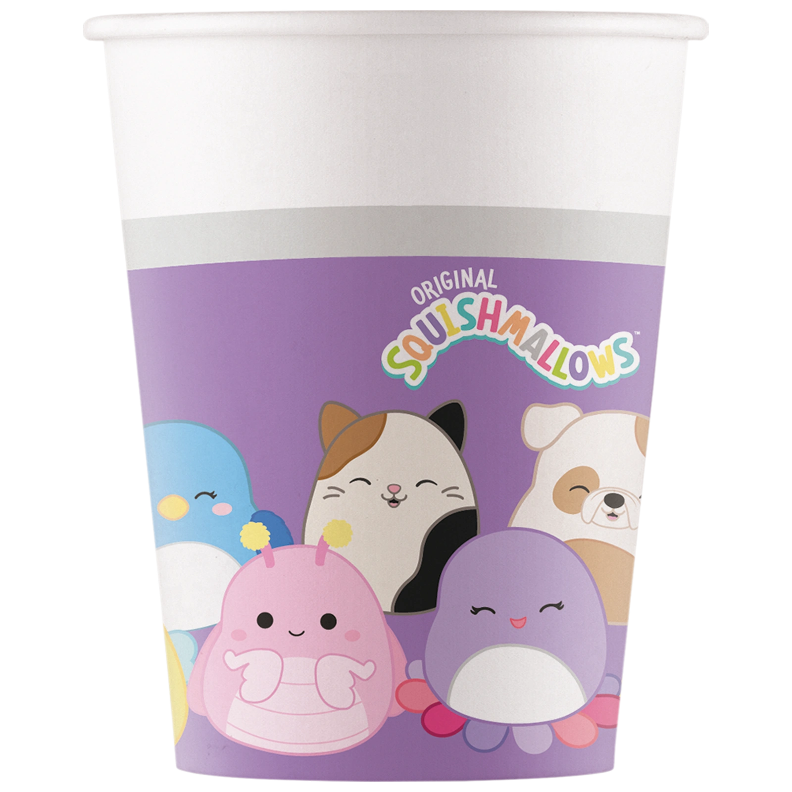 Ekologiczne kubki papierowe, z kolorowym nadrukiem z motywem Squishmallows, o pojemności 200 ml. Świetnie sprawdzą się na imprezach urodzinowych dziecka czy na przyjęciach, w których uczestniczą najmłodsi.