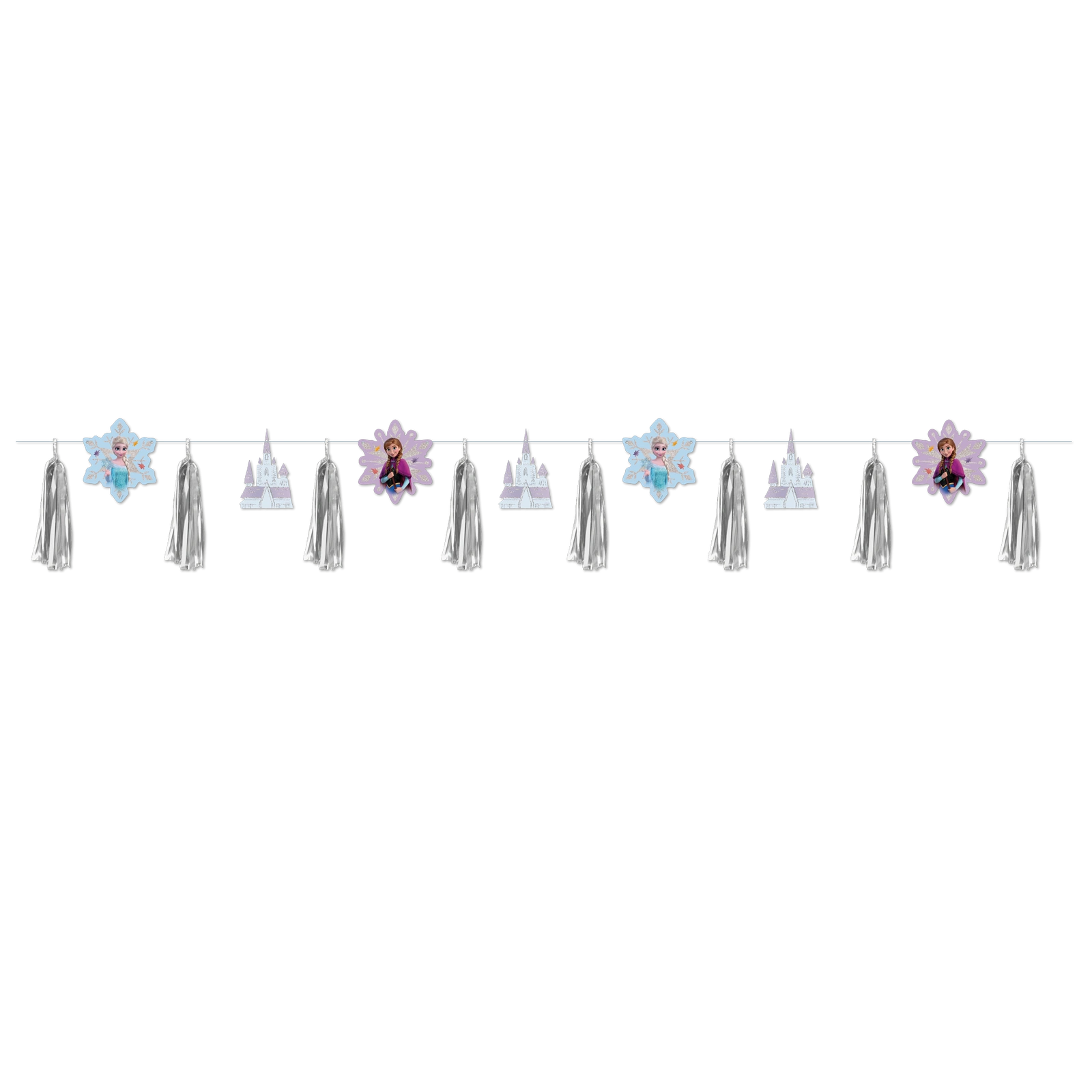 Papierowa girlanda z motywem Frozen. Jest ona wyposażona w dekoracyjne śnieżynki z Elsą i Anną, zameczki i srebrne warkocze. Ma ona długość 230 cm.