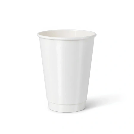 Białe, zupełnie gładkie (bez nadruków producenta), dwuwarstwowe kubki papierowe o pojemności 350 ml i średnicy 90 mm.