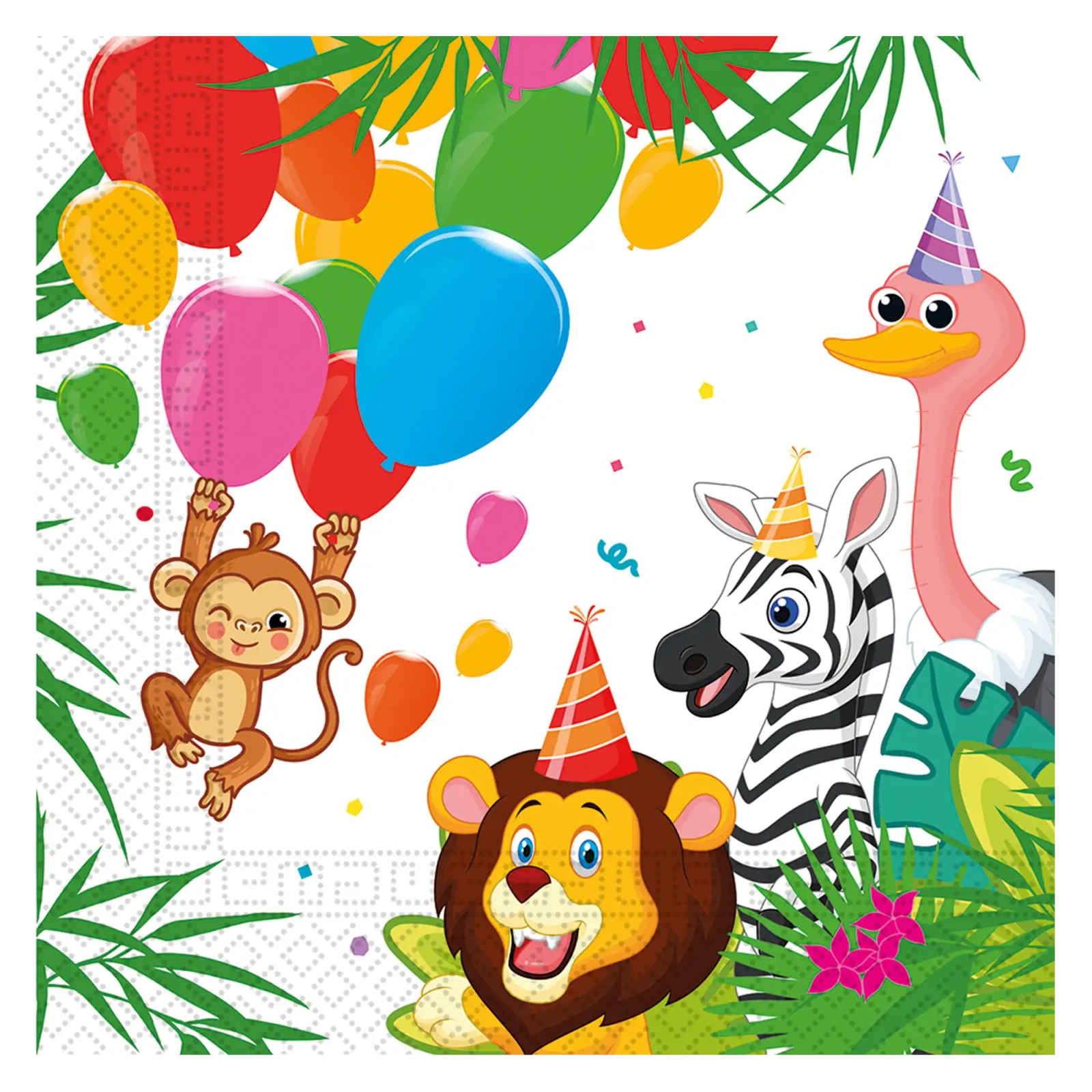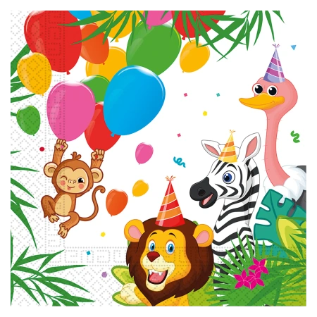 Zestaw 20stu sztuk dwuwarstwowych serwetek ozdobnych z motywem Jungle o wymiarach 33 × 33 cm, wykonanych w 100% z papieru, to praktyczny i dekoracyjny dodatek na urodziny oraz inne dziecięce przyjęcia. Serwetki świetnie sprawdzą się przy nakrywaniu stołu, dodając imprezie kolorowego i tematycznego charakteru.